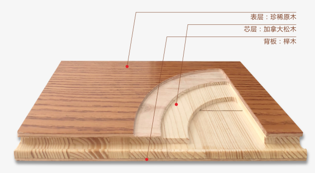 壓貼背板及名貴木皮:在基材的桉木層表面覆蓋壓貼厚度為0.012cm的名貴樹種木材材料,并在基材的背面壓貼厚度為0.005cm的德國(guó)櫸木材料。