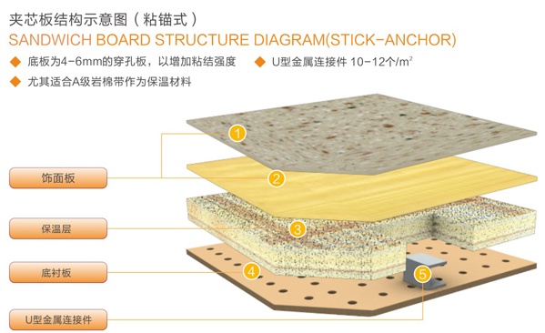 由保溫裝飾夾心板、粘結砂漿、錨固件、嵌縫材料和密封膠等材料構成,采用粘結砂漿粘結為主、錨固件連接為輔施工工藝將保溫裝飾夾心板安裝在建筑外墻外表面的非承重保溫裝飾構造總稱。