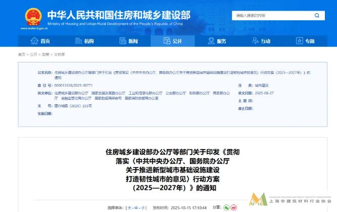 10月15日,住建部、發改委等九部門印發關于《貫徹落實〈中共中央辦公廳、國務院辦公廳關于推進新型城市基礎設施建設 打造韌性城市的意見〉行動方案(2025—2027年)》的通知,提出推動實施智能化市政基礎設施建設和改造等九大方面舉措。